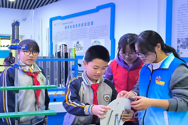 4月10至12日,BB贝博艾弗森“e点光”志愿服务队携手物理演示实验室开展实验室开放日活动。十堰市外国语小学的34名师生走进物理演示实验室体验科学的奥妙。